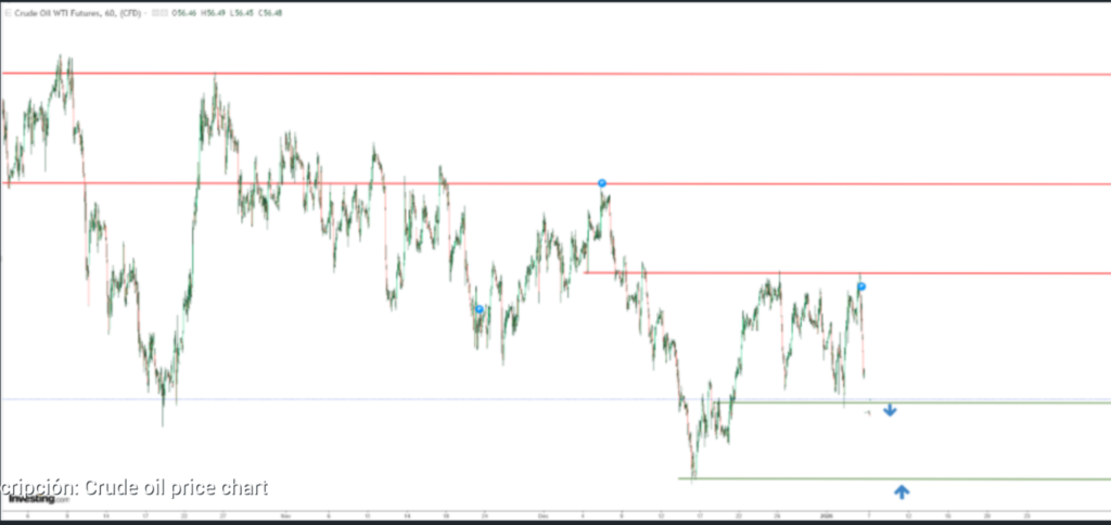 Desde el punto de vista del mercado, el petróleo no logró romper la resistencia cercana a 59 USD por barril y entró en una fase de consolidación. El nivel de 56 USD aparece ahora bajo presión.