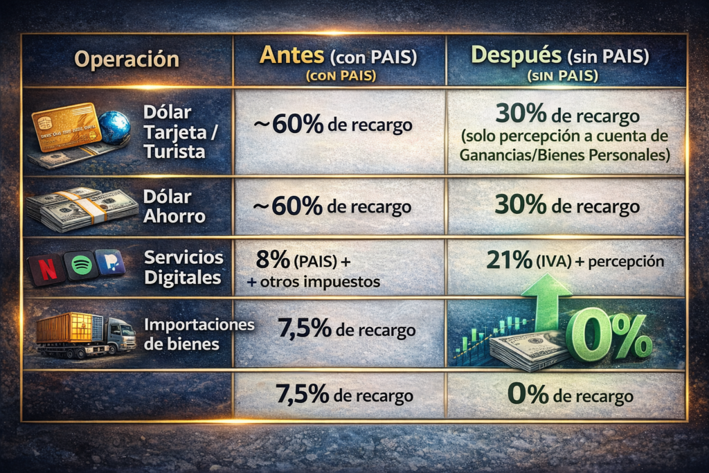 Aunque el impuesto PAIS desapareció, el “cepo” cambiario no fue levantado automáticamente. Las percepciones a cuenta de Ganancias y Bienes Personales (30%) continúan aplicándose a las operaciones involucradas en la compra de moneda extranjera o pagos internacionales, constituyendo el principal recargo actual sobre estas transacciones.